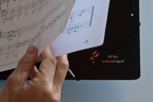 Le cordon auprès de la spirale sert à insérer un pliant ou des partitions. Un deuxième cordon, qui traverse les deux coins de la couverture arrière, fixe une feuille séparée. Il peut aussi être utilisé pour fermer le dossier de concert ou comme marque-page pour retrouver rapidement la page souhaitée.